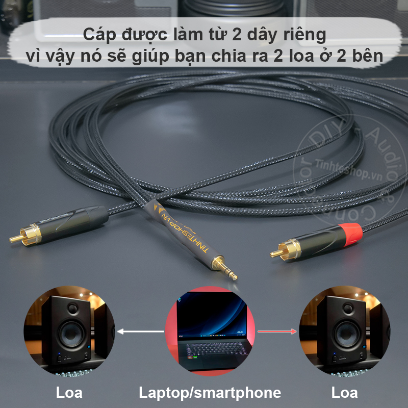 Cáp 3.5 ra 2 đầu bông sen được mình DIY với 2 dây riêng biệt để nó có thể tách ra cắm cho 2 loa ở 2 bên biến thành R-L.
