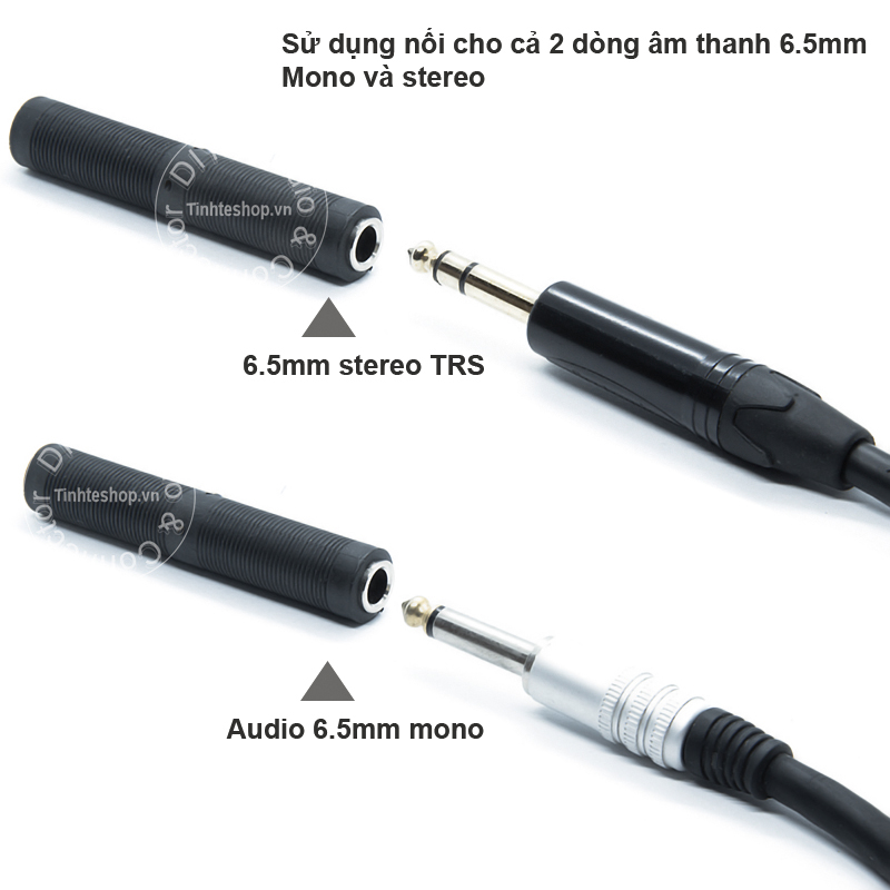 - Làm khớp nối liên kết giữa 2 Cáp audio 6.5mm lại với nhau để tạo thành 1 sợi dây kéo dài hoàn chỉnh.